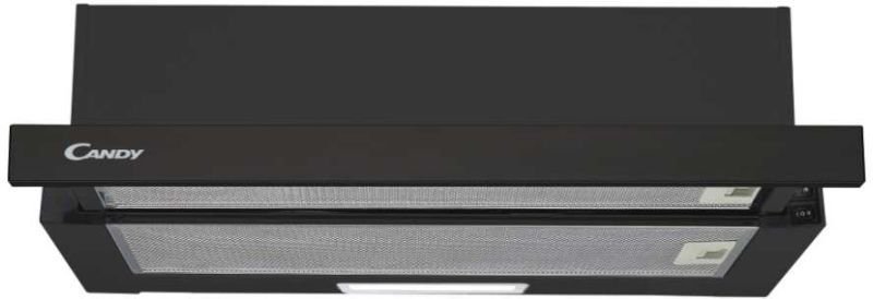 : CandyTeleskopický odsávač pár šírky 60 cm - Odťah aj recirkulácia, mechanický posuvný ovládač, halogénové osvetlenie, hliníkový filter